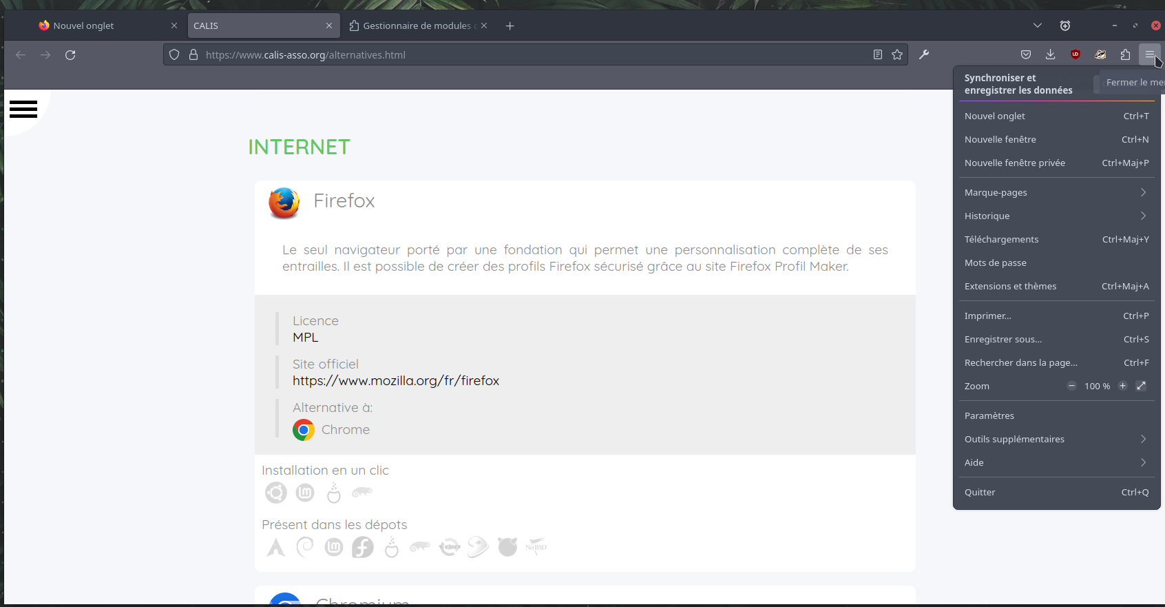 La version Libre et sans trackers du Navigateur de Google. Il est important d'avoir plusieurs navigateurs afin d'avoir une compatibilité totale du web et de séparer les usages si nécessaire.