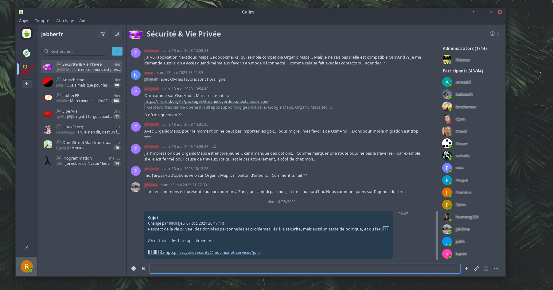 Un client XMPP très complet. Il est possible de passer des appels audio mais l'audioconférence pour plus de 2 utilisateurs n'est pas encore supportée La qualité du son et la latence est également en deça de ce que Mumble propose et il est nécessaire de se connecter à un serveur pour pouvoir converser. La grande force du logiciel réside dans l'exploitation du protocole XMPP à travers une interface organisée paramétrable et agréable.