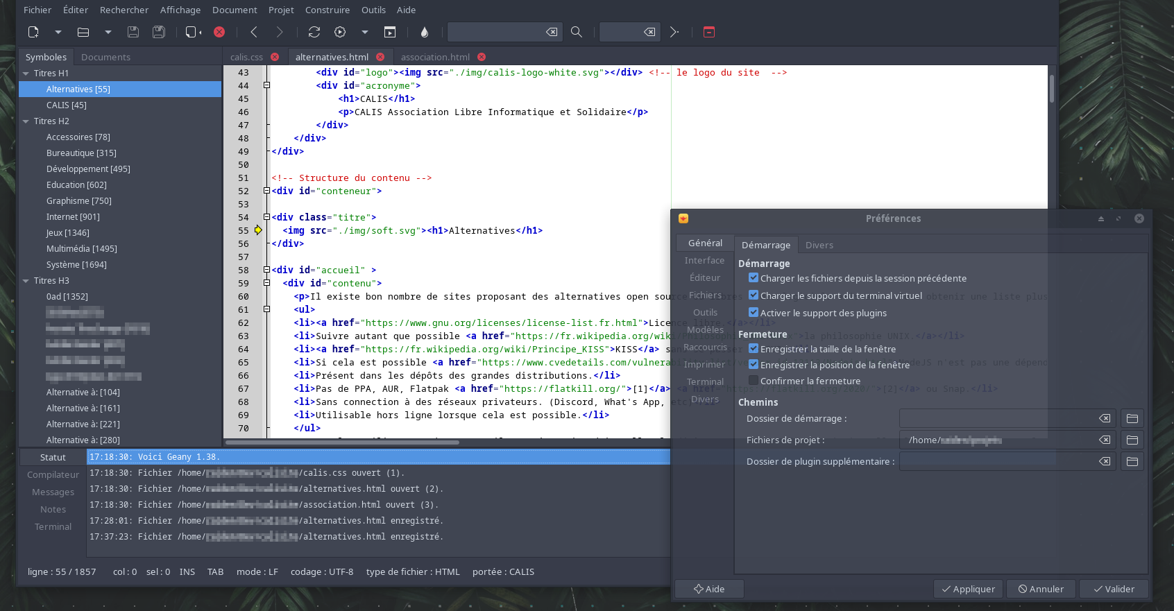 Un éditeur de code simple et léger basé sur GTK avec de nombreuses fonctionnalités telles que la coloration syntaxique, l'auto-complétion, une vue des projets via un navigateur de fichier ou encore la console de compilation. Geany peut être étendu grâce au paquet geany-plugins. Il prend en charge de nombreux langages de programmation.
